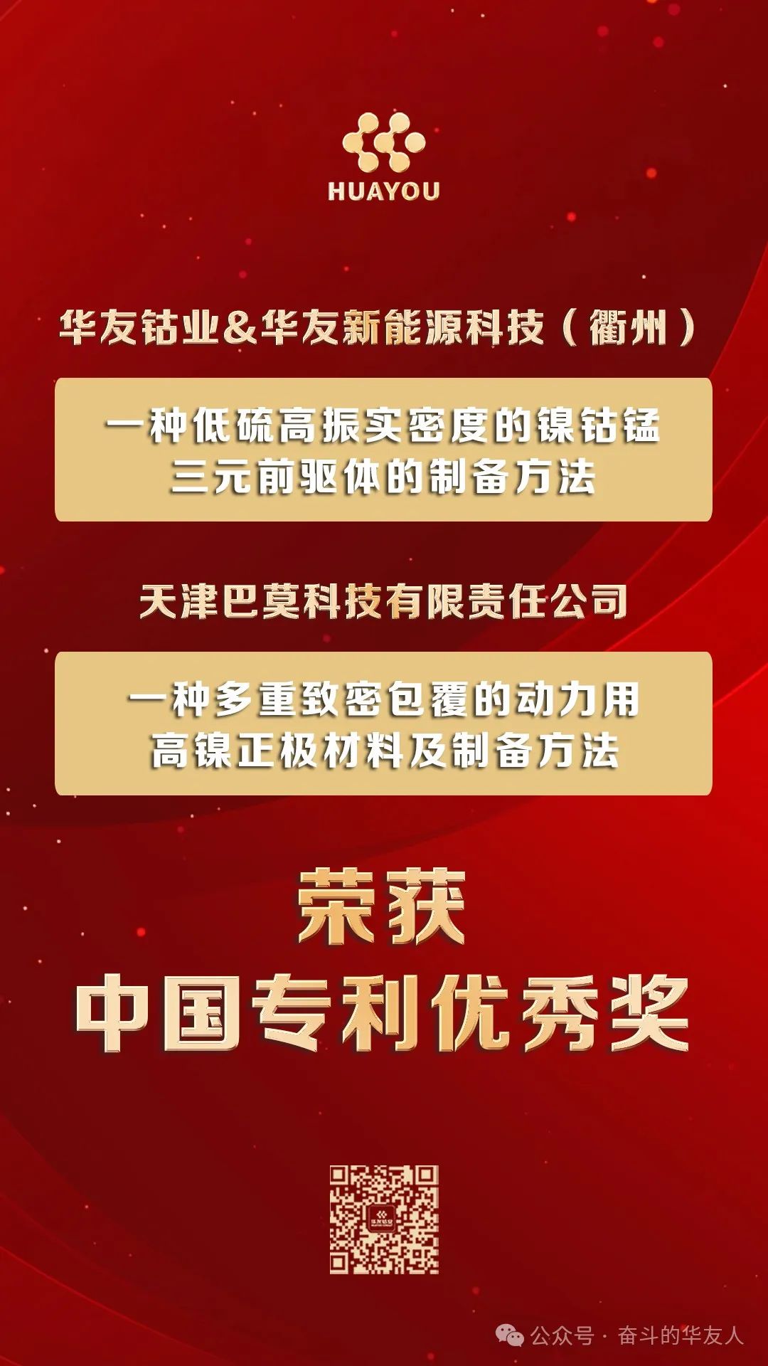 Recently, the National Intellectual Property Administration announced the review results of the 25th China Patent Awards. Huayou Cobalt Industry and its subsidiary Huayou New Energy Technology (Quzhou) Co., Ltd.'s invention patent titled "A Method for Preparing Low-Sulfur High Tap Density Nickel-Cobalt-Manganese Ternary Precursor" along with Tianjin Bamo Technology Co., Ltd.'s invention patent titled "A Method for Preparing High-Nickel Cathode Materials for Power Batteries with Multiple Dense Coatings" were awarded the China Patent Excellence Award.