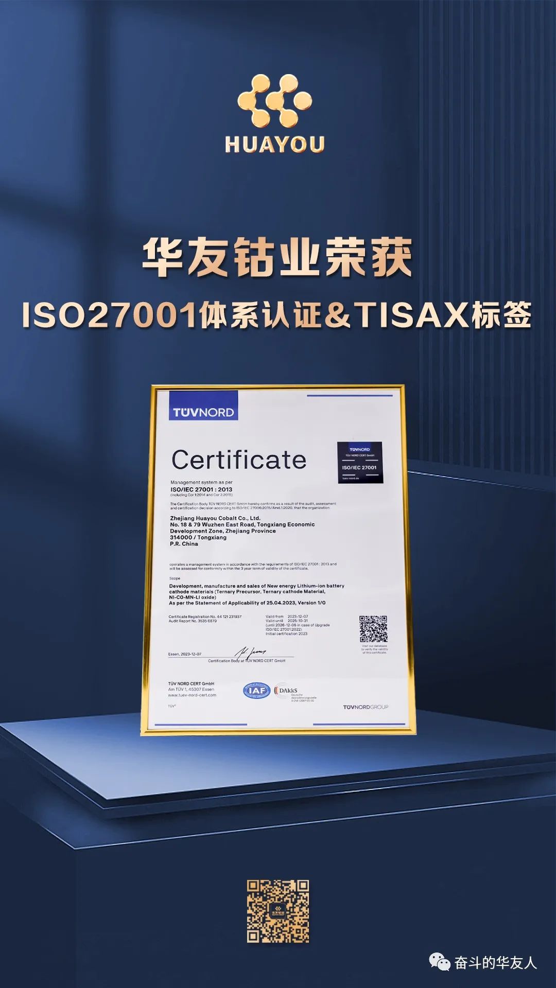 TISAX,由德國汽車工業(yè)協(xié)會推出,是信息安全領(lǐng)域的最高標準之一,主要用于評估和認證汽車供應鏈中的信息安全管理體系,以確保汽車行業(yè)的高安全標準,保護敏感信息和防止數(shù)據(jù)泄露。目前,TISAX認證在全球范圍的汽車主機廠商中備受推崇,供應商通過了該評估認證,即意味著得到了含汽車主機廠在內(nèi)的所有參與方的認可。獲得TISAX標簽,意味著華友的信息安全體系得到了業(yè)界的廣泛認可,是進軍國際新能源汽車供應鏈的通行證。