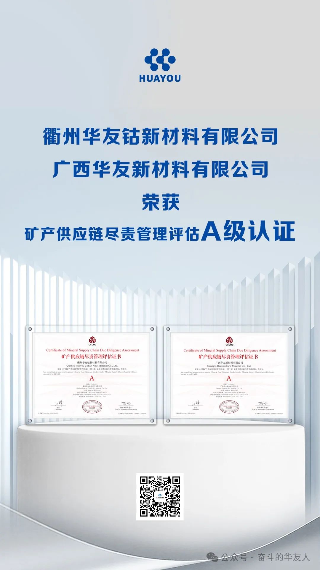 衢州華友鈷新材料有限公司和廣西華友新材料有限公司電鎳率先通過礦產(chǎn)供應(yīng)鏈盡責(zé)管理評估,中國五礦化工進(jìn)出口商會頒發(fā)了礦產(chǎn)供應(yīng)鏈盡責(zé)管理評估A級證書。